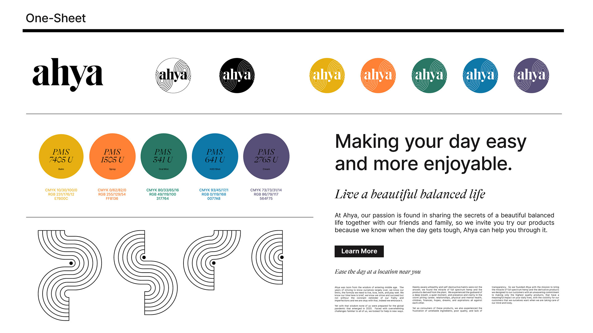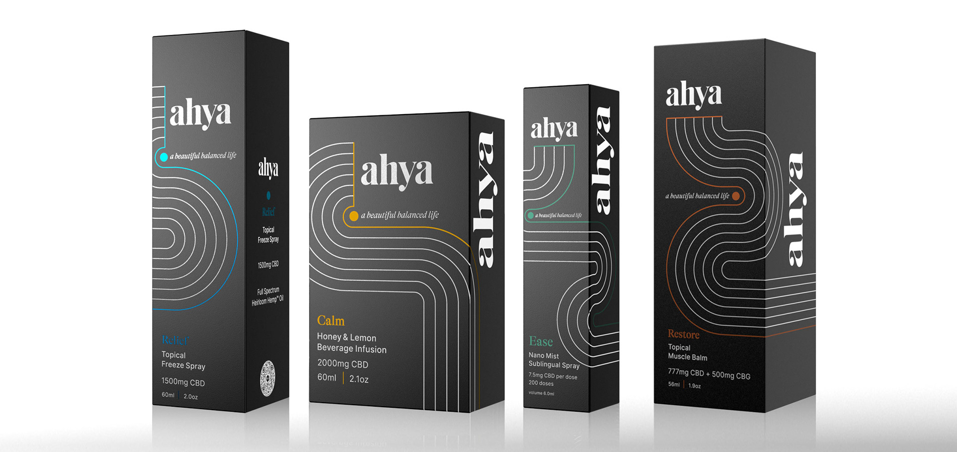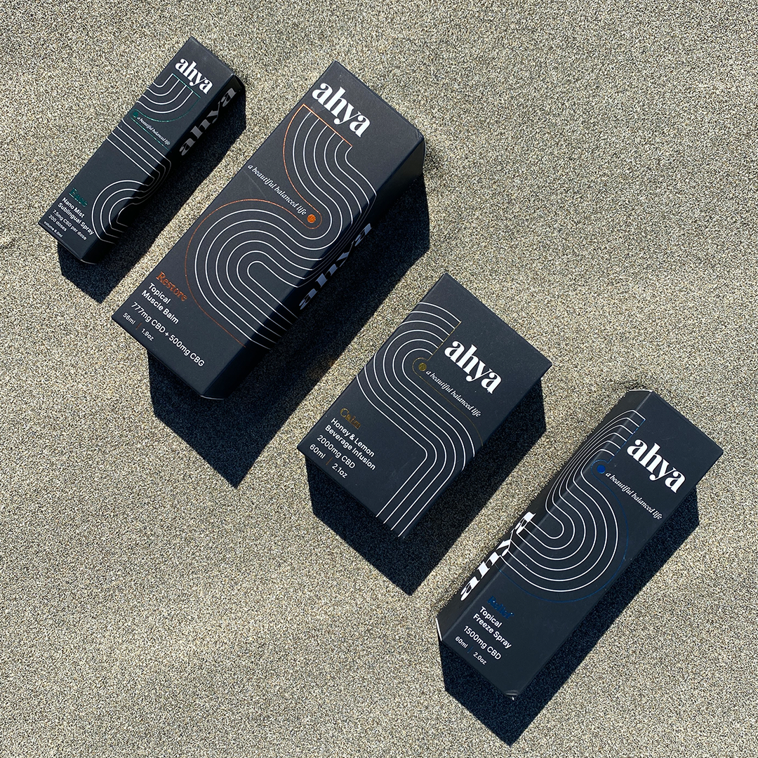 A beautiful balanced life. In a sea of sameness, selection overdose, and ineffective formulas that leave us searching for more, leading to wasted time, effort, and money - Ahya makes plant-based, organic, and ethically sourced CBD products that are good for your body. We partnered with co-founders Ashley & Greg to create a name, brand, and strategy as beautiful as their perfectly balanced products. The name Ahya was derived from the expression you make when things just feel right…ahh yeah. Our graphic rake line treatment is used to bring a sense of calm and animated dynamically to reveal our brand promise, product, or wordmark. Each product package has a distinct color and rake pattern printed with hot foil and white ink on matte black card-stock that elegantly stands out on shelf.