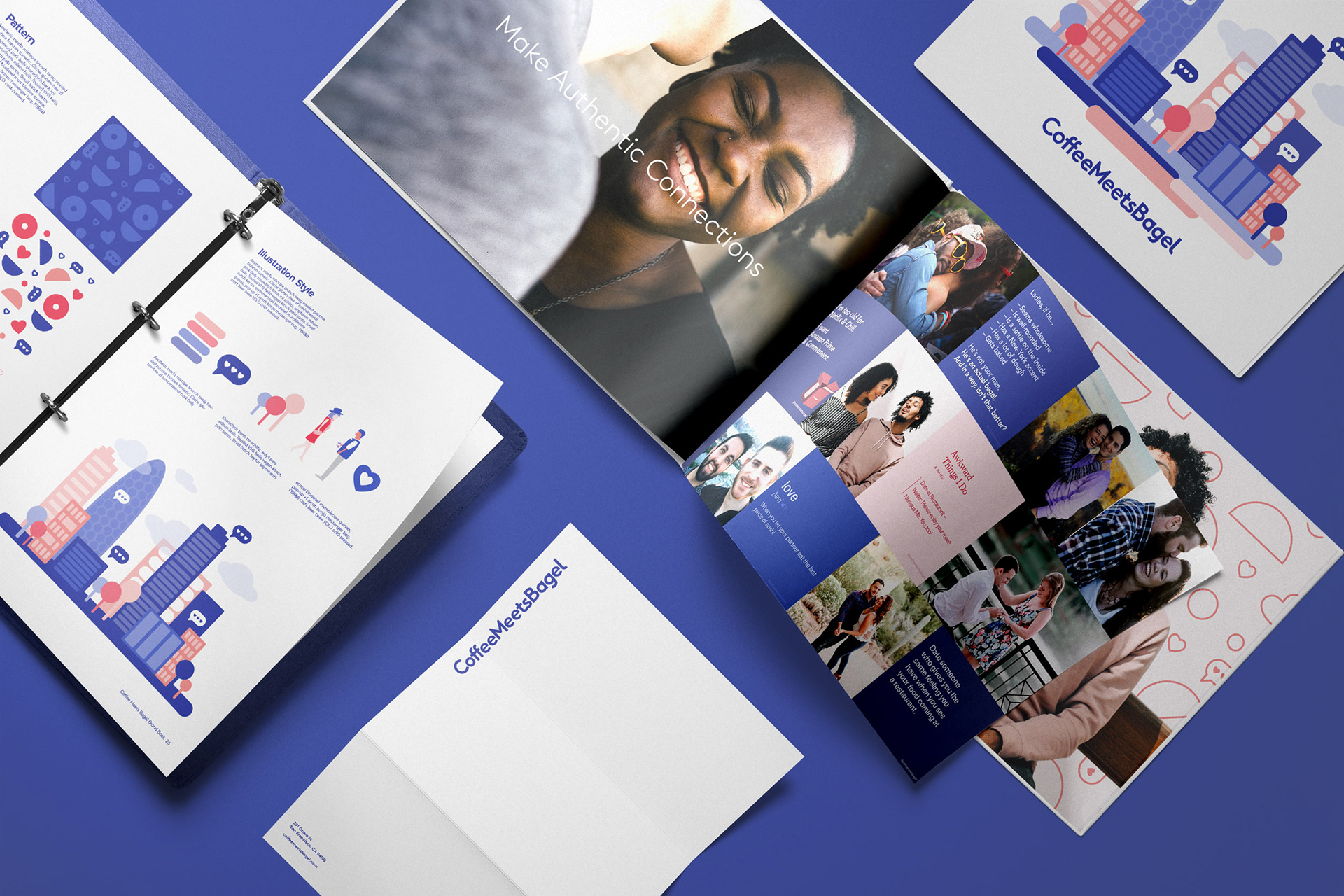 Our challenge was to help Coffee Meets Bagels mature, maintaining its cuteness, but balanced with sophistication and a much-needed sense of functionality. CMB is now accessible, more mature, and fits better on the screen. The new logo icon uses ‘CMB’ to signify connection, but in an honest way. The custom wordmark is a tighter, more elegant display. It’s close kerning and nearly pure geometric forms closely draw from the icon, using the ligatures of ‘ff’ and ‘ts’ to create small moments of connection. The new logo adds flexibility and legibility, without losing the cuteness and coziness of its predecessor. The ‘C’ and ‘B’ are two distinct, individual pieces, with the opportunity to join each other by the ‘M’ heart. It leaves space for the unknown, but provides comfort with its pillow-like curves. Additionally, a custom illustrated pattern utilizes brand imagery to poke fun at the chaos of dating – streams of coffee and bagels finding each other across the screen.