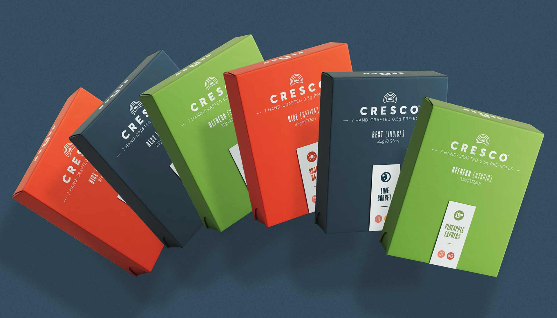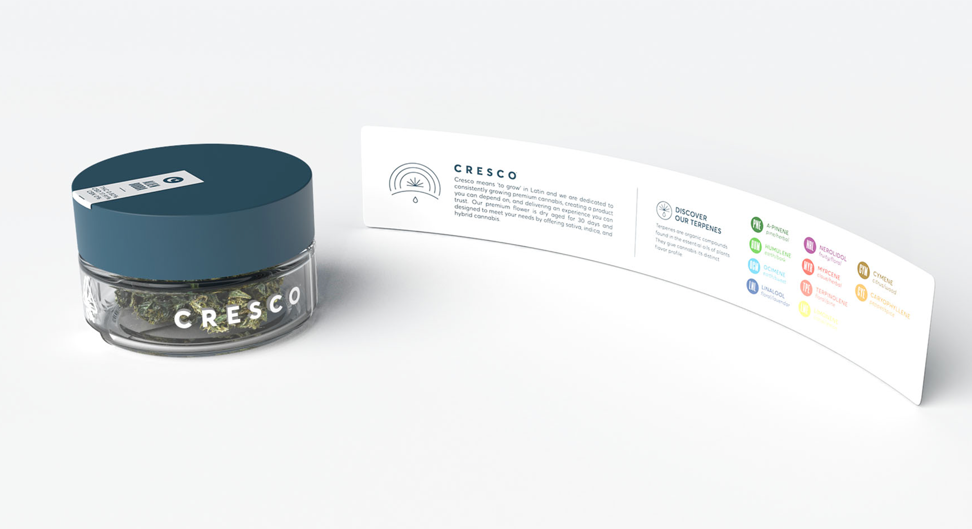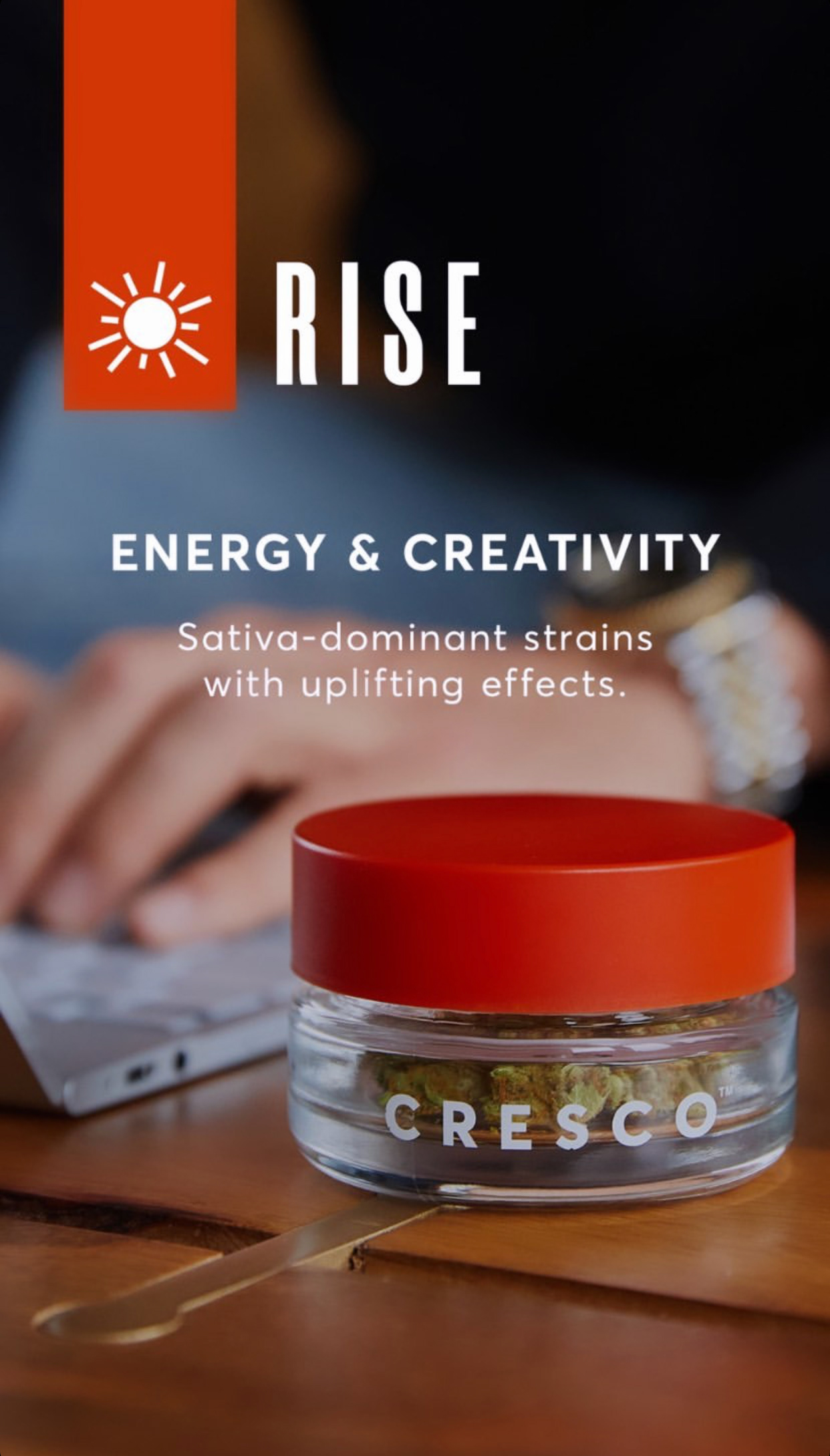 The word Cresco is Latin for ‘to grow,’ and the entire brand reflects this theme. For the Cresco flagship brand, the logo plays on the 7-pointed star of the cannabis leaf, but makes it its own in an abstract form that also parallels the sun on the horizon. Many cannabis brands don’t grow their own product, so Cresco’s brand has to highlight the holistic nature of the business and the quality of their work. The three rings of the sun represents the 30 days for which the cannabis is dry-aged. The logo feels pure, and when placed on clear packaging, the transparency allows for customers to see the quality of the product for themselves. Custom iconography educates users about the terpenes in the product – a full language for customers to clearly understand what is in their product and how it will make them feel. This iconography is repeated across brand channels to help create cohesion under the Cresco umbrella.