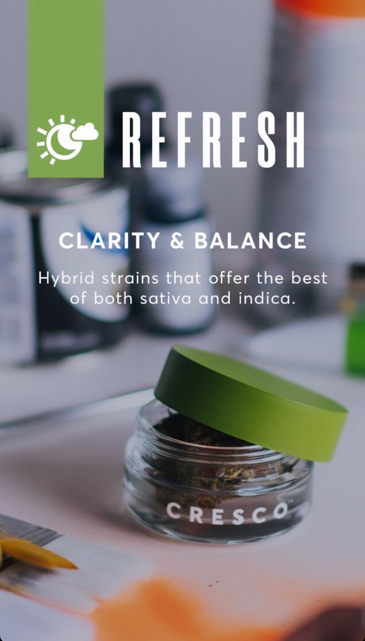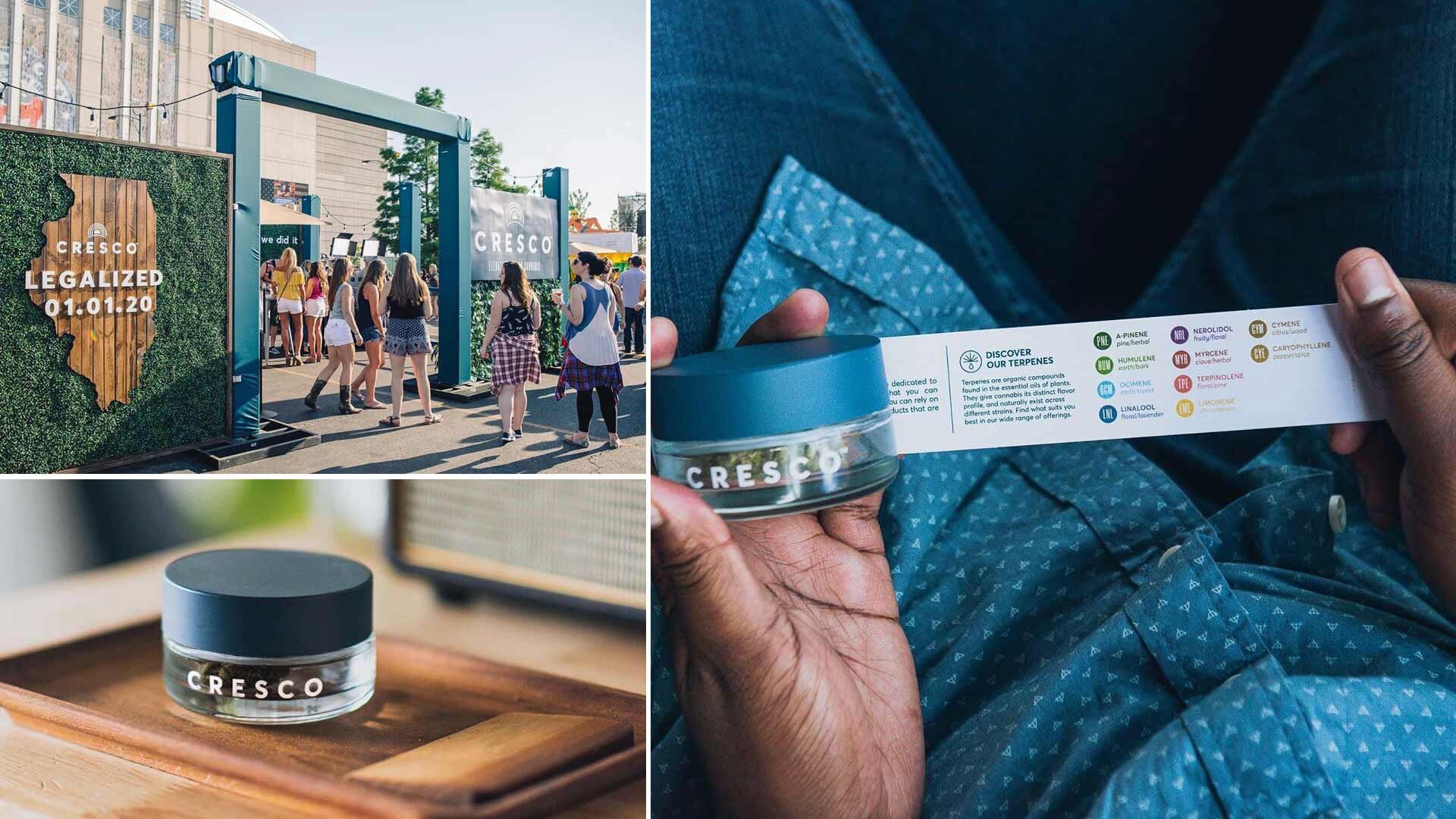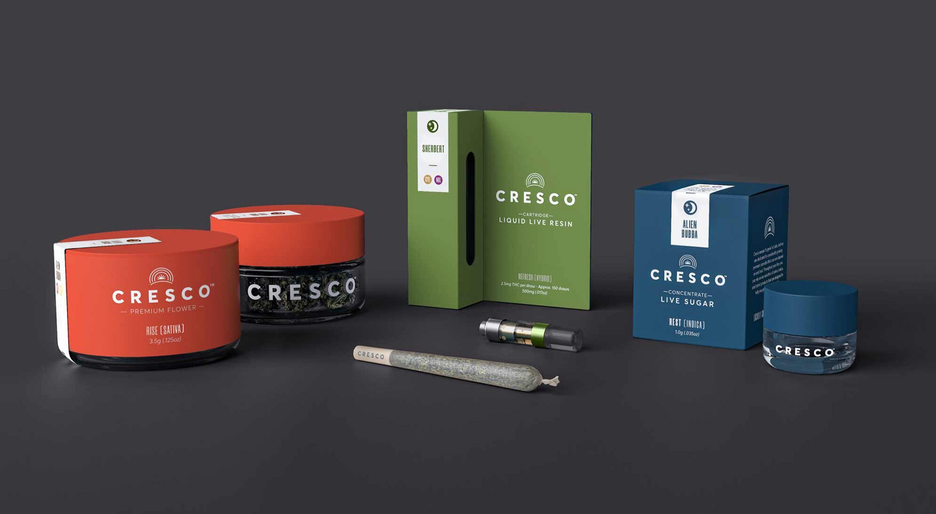 The word Cresco is Latin for ‘to grow,’ and the entire brand reflects this theme. For the Cresco flagship brand, the logo plays on the 7-pointed star of the cannabis leaf, but makes it its own in an abstract form that also parallels the sun on the horizon. Many cannabis brands don’t grow their own product, so Cresco’s brand has to highlight the holistic nature of the business and the quality of their work. The three rings of the sun represents the 30 days for which the cannabis is dry-aged. The logo feels pure, and when placed on clear packaging, the transparency allows for customers to see the quality of the product for themselves. Custom iconography educates users about the terpenes in the product – a full language for customers to clearly understand what is in their product and how it will make them feel. This iconography is repeated across brand channels to help create cohesion under the Cresco umbrella.