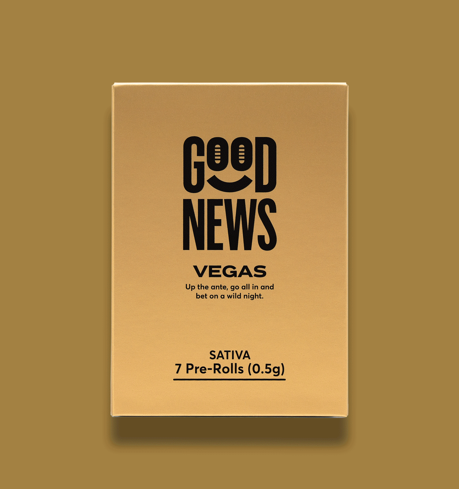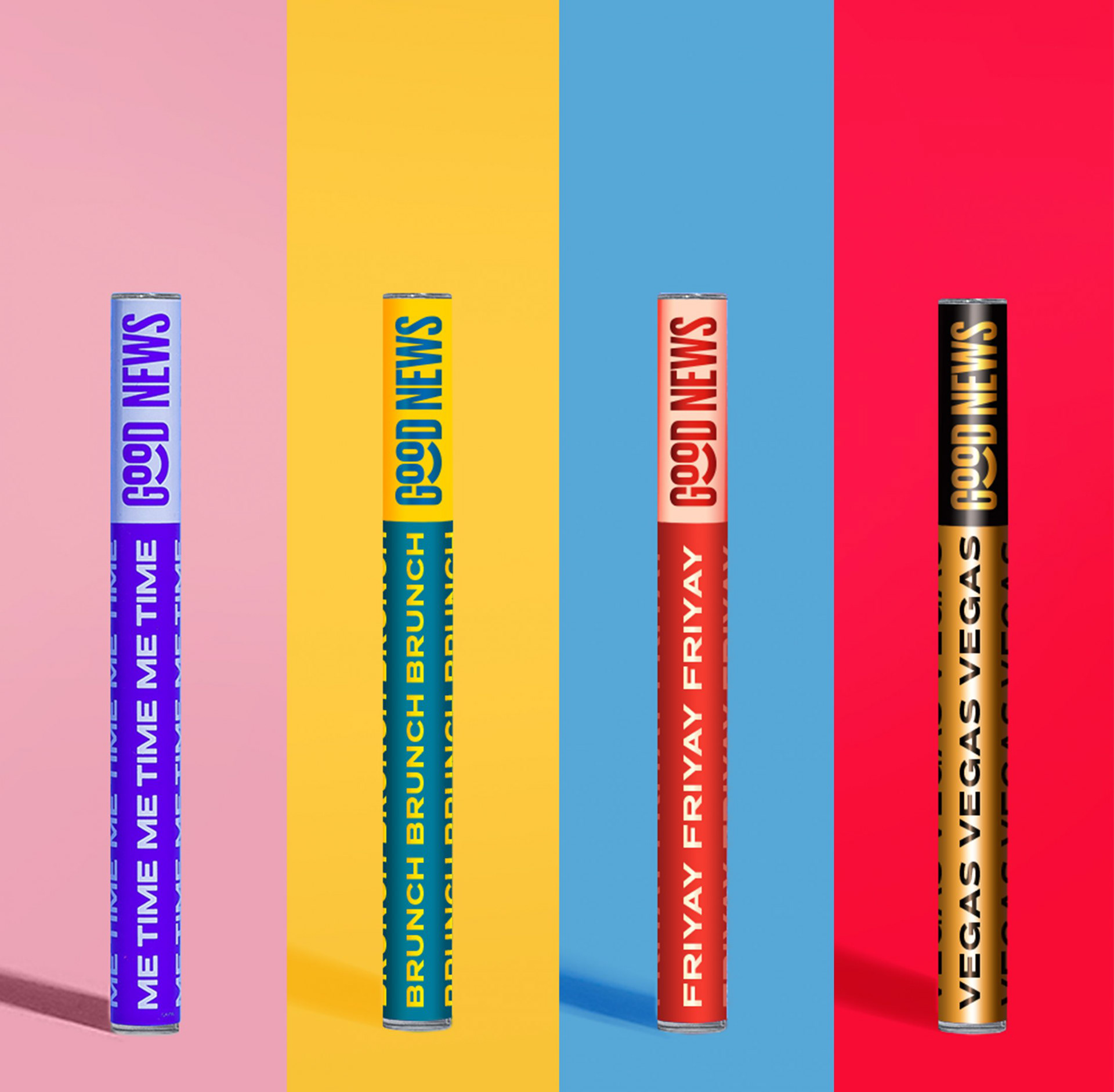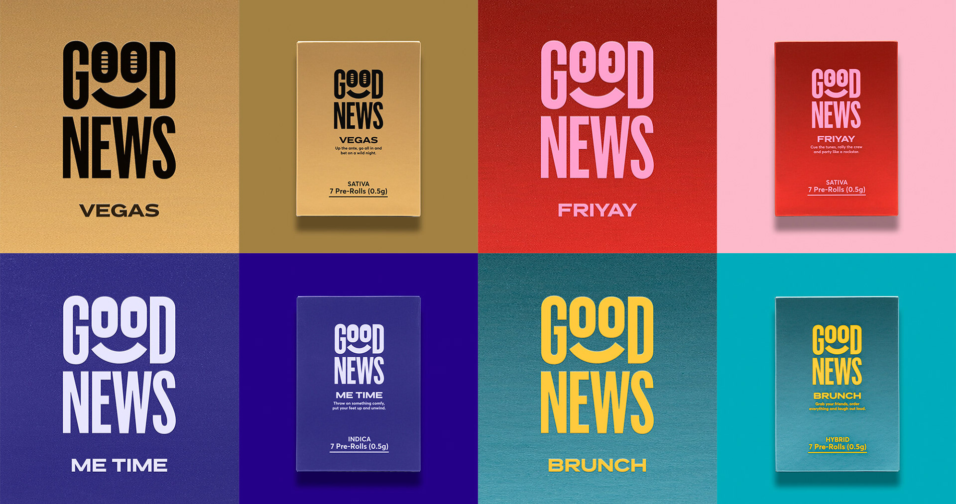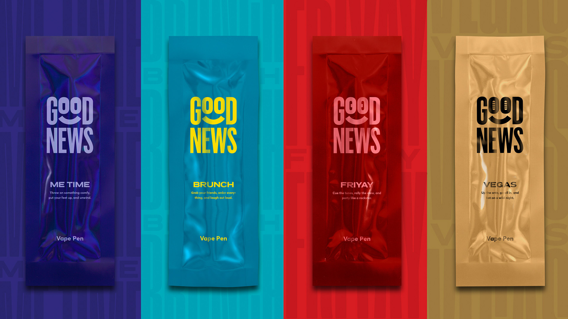 It’s so good. Cannabis is recreational. That means we’re allowed to have some fun with it. Good News celebrates the recreational side of weed with every aspect of the brand. The smiling logo speaks for itself – a motif that extends across the brand, with eyes that change to show what type of high each product provides. Derived from Flama typeface, the custom wordmark is playful and bold, bubbly but professional. Unlike brands that work to educate consumers, Good News knows you already know, and just wants you to have some fun with it. With product names like ‘Friyay,’ ‘Me Time,’ ‘Brunch,’ and ‘Vegas,’ the product hierarchy is all about the good time you’re about to have. It’s a brand built around a smile. Life is hard enough – we could all use some good news to cheer us up. Good News was a 2020 Clio Cannabis Brand + Identity winner for Bright Side of Cannabis.