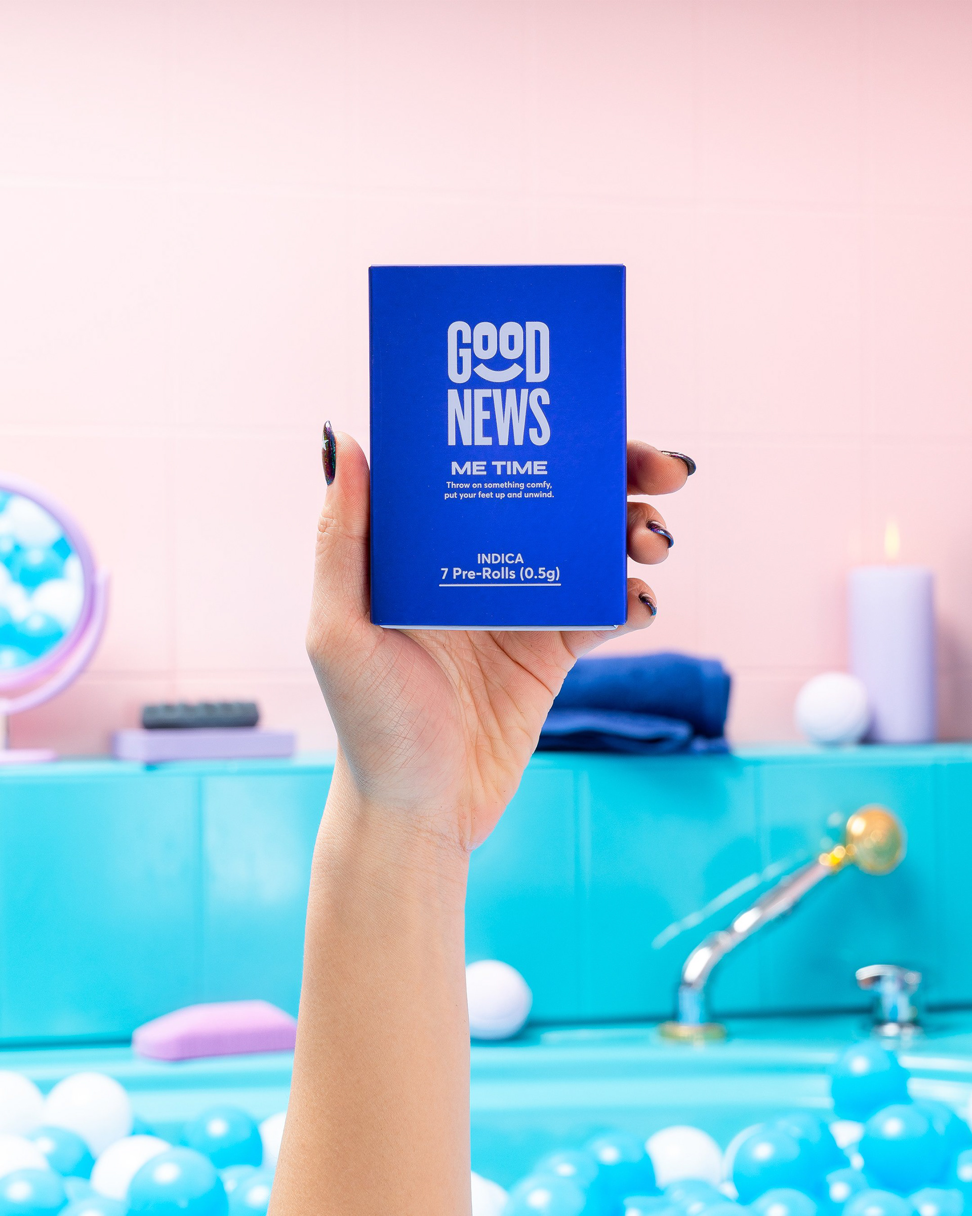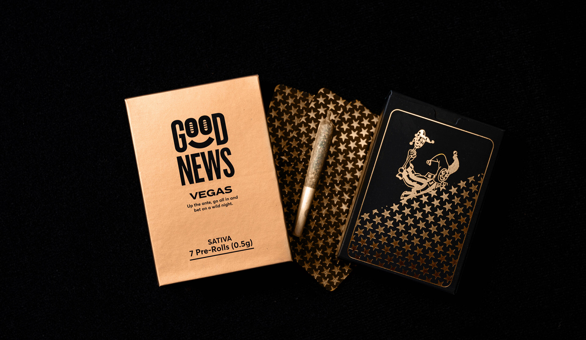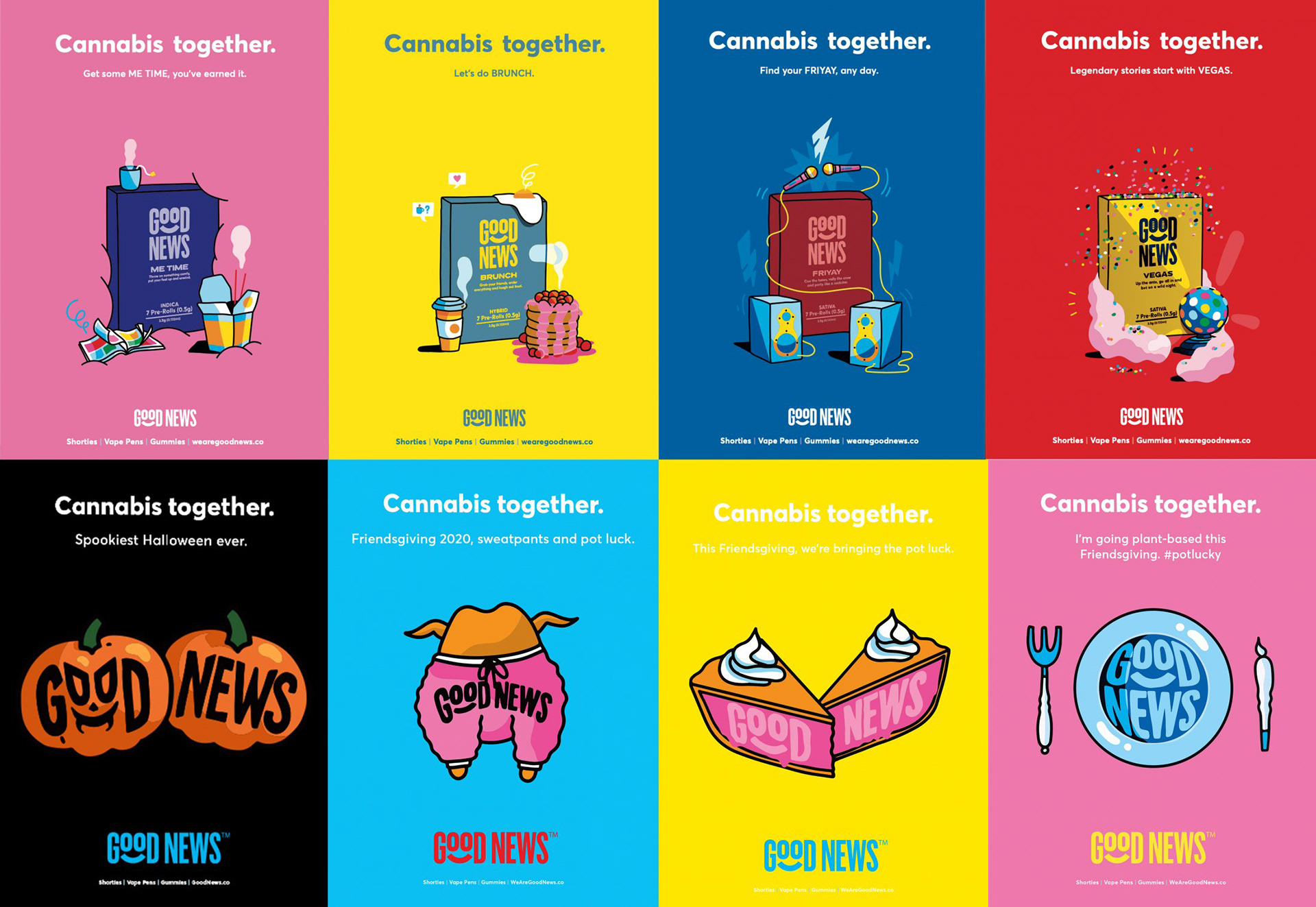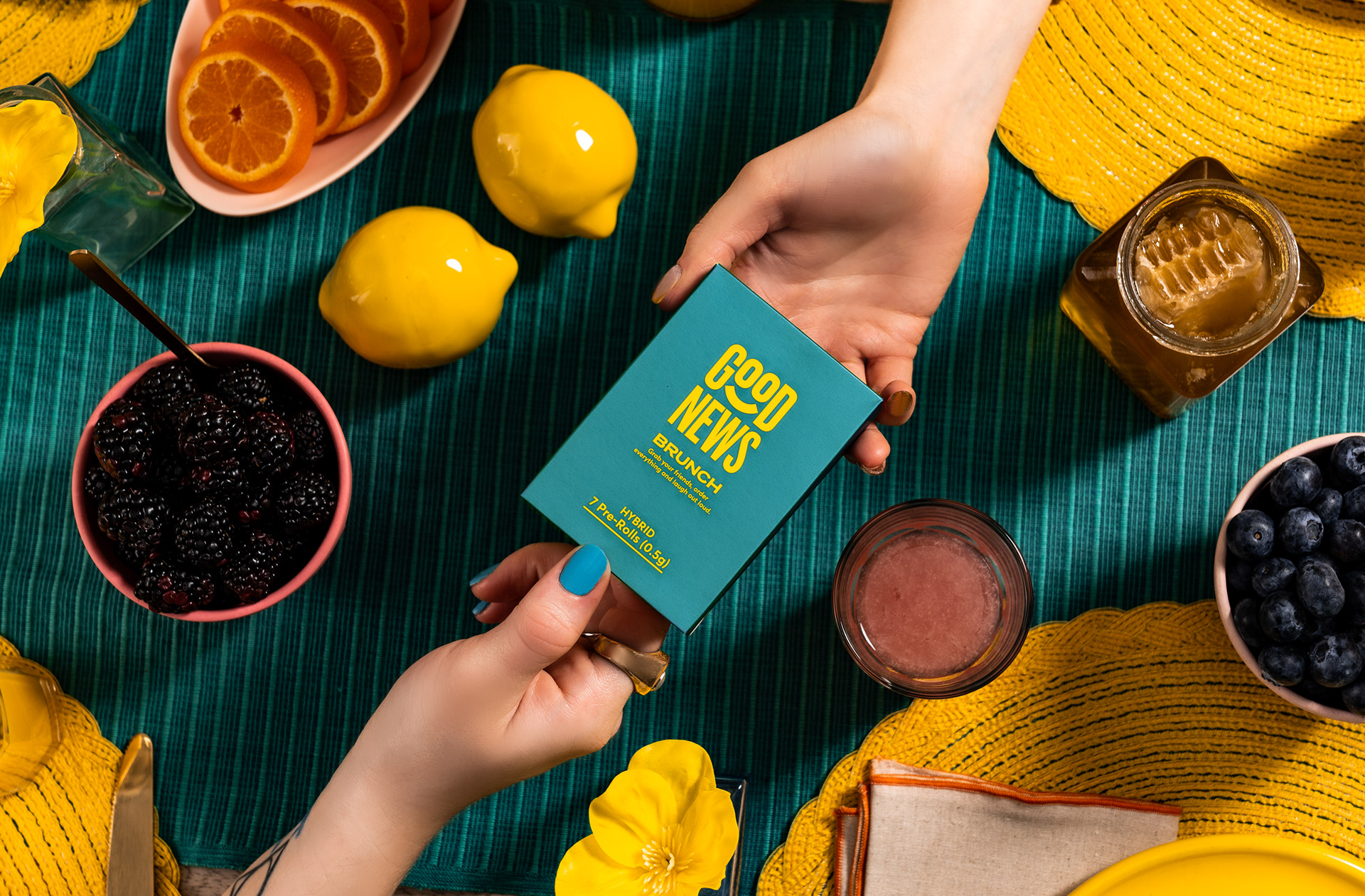 It’s so good. Cannabis is recreational. That means we’re allowed to have some fun with it. Good News celebrates the recreational side of weed with every aspect of the brand. The smiling logo speaks for itself – a motif that extends across the brand, with eyes that change to show what type of high each product provides. Derived from Flama typeface, the custom wordmark is playful and bold, bubbly but professional. Unlike brands that work to educate consumers, Good News knows you already know, and just wants you to have some fun with it. With product names like ‘Friyay,’ ‘Me Time,’ ‘Brunch,’ and ‘Vegas,’ the product hierarchy is all about the good time you’re about to have. It’s a brand built around a smile. Life is hard enough – we could all use some good news to cheer us up. Good News was a 2020 Clio Cannabis Brand + Identity winner for Bright Side of Cannabis.