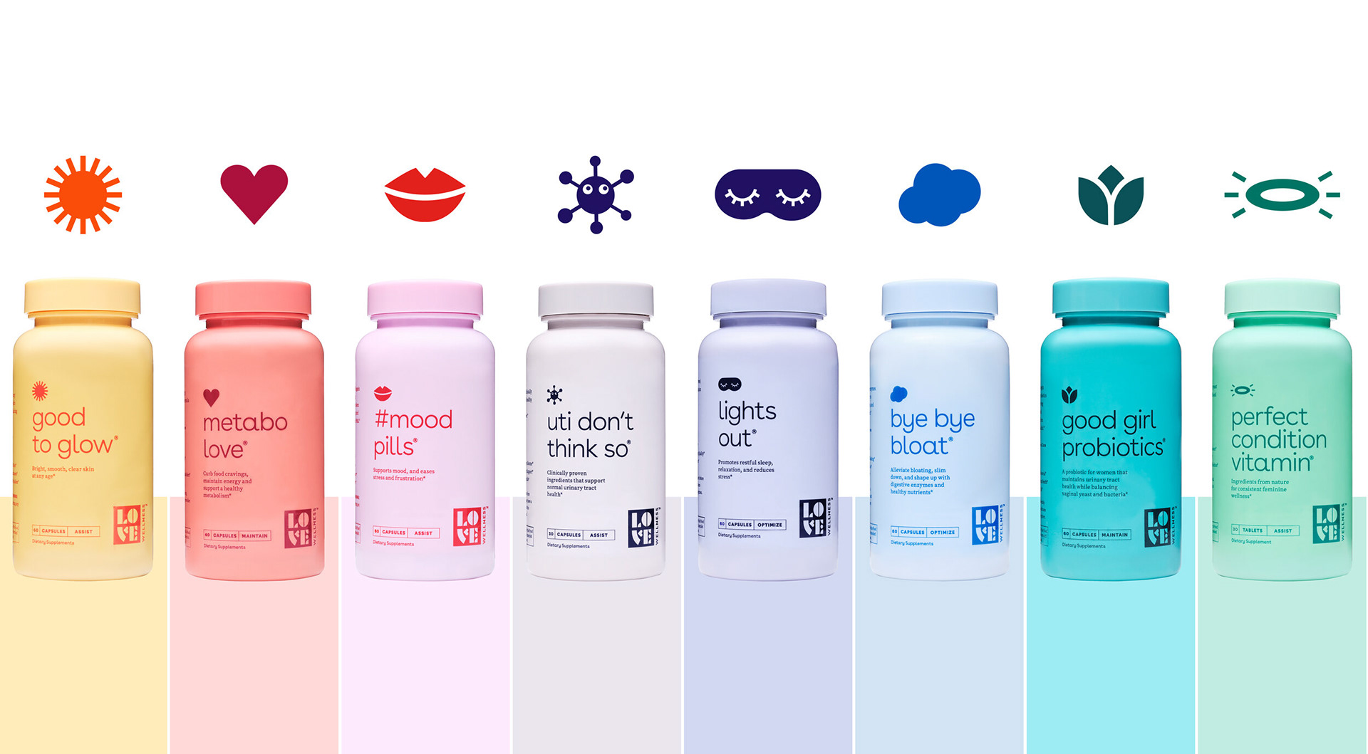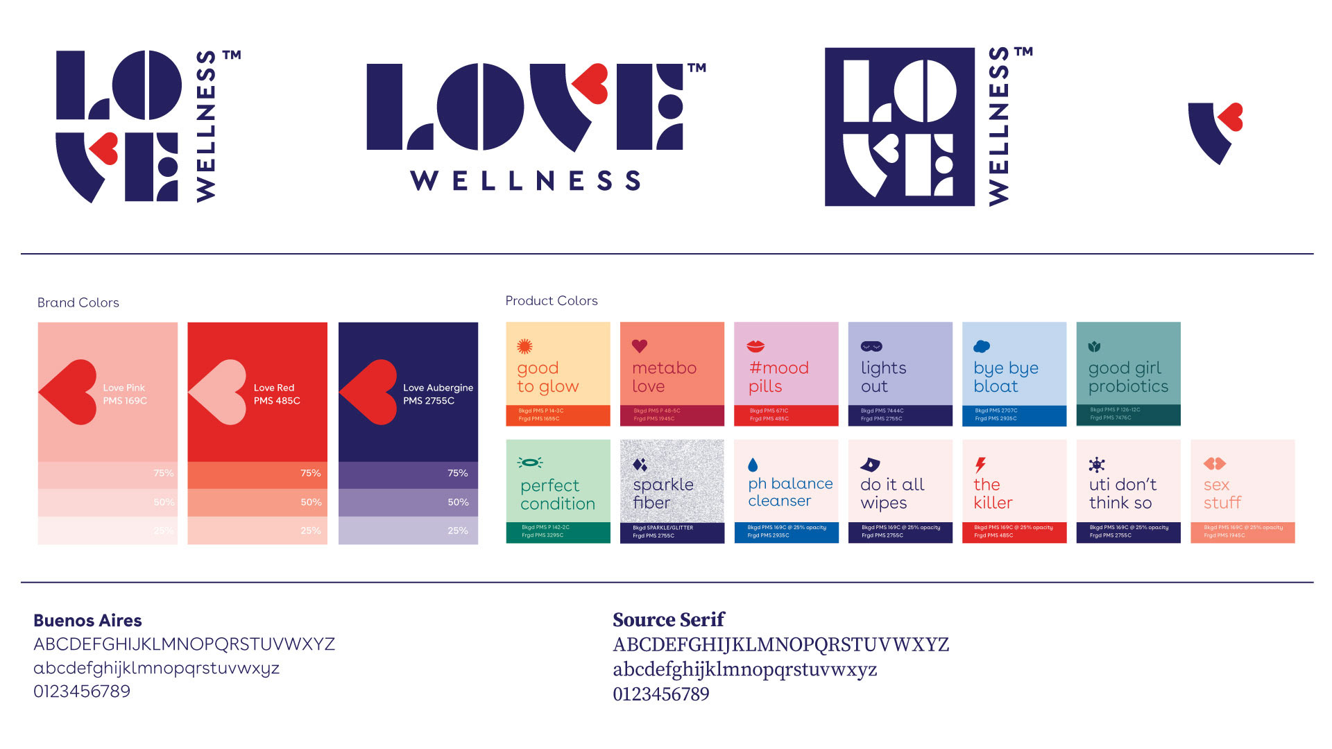 When Lo Bosworth developed Love Wellness, her goal was to offer all-natural remedies for common women’s health issues. The brand, reflecting Lo’s joyous, playful, and driven personality, needed to be fun and friendly while clearly conveying product benefits. Inspired by a late 1930s art deco type specimen, we created custom, playful, and expressive letterforms for the logo. The ‘V’ in the logo was designed as a face with lips to kiss and talk, tying into the brand’s illustrative style. Each product features quirky names, corresponding illustrations, and unique color combinations, giving Love Wellness a distinctive look. Launching in ULTA stores nationwide and online, Love Wellness has made a significant impact, even taking over Times Square for its debut. We’re thrilled to have helped make women’s health more approachable and beautiful.