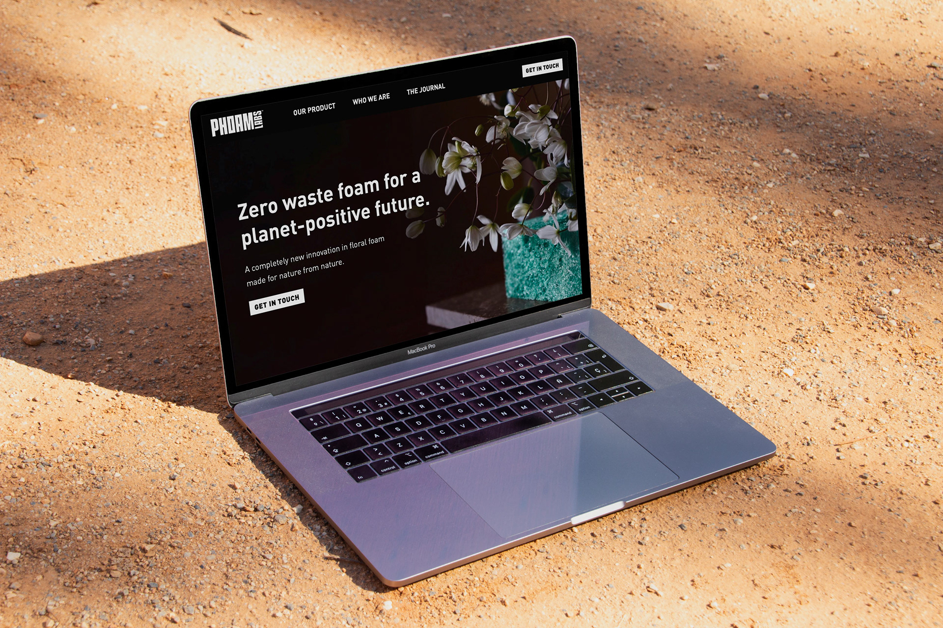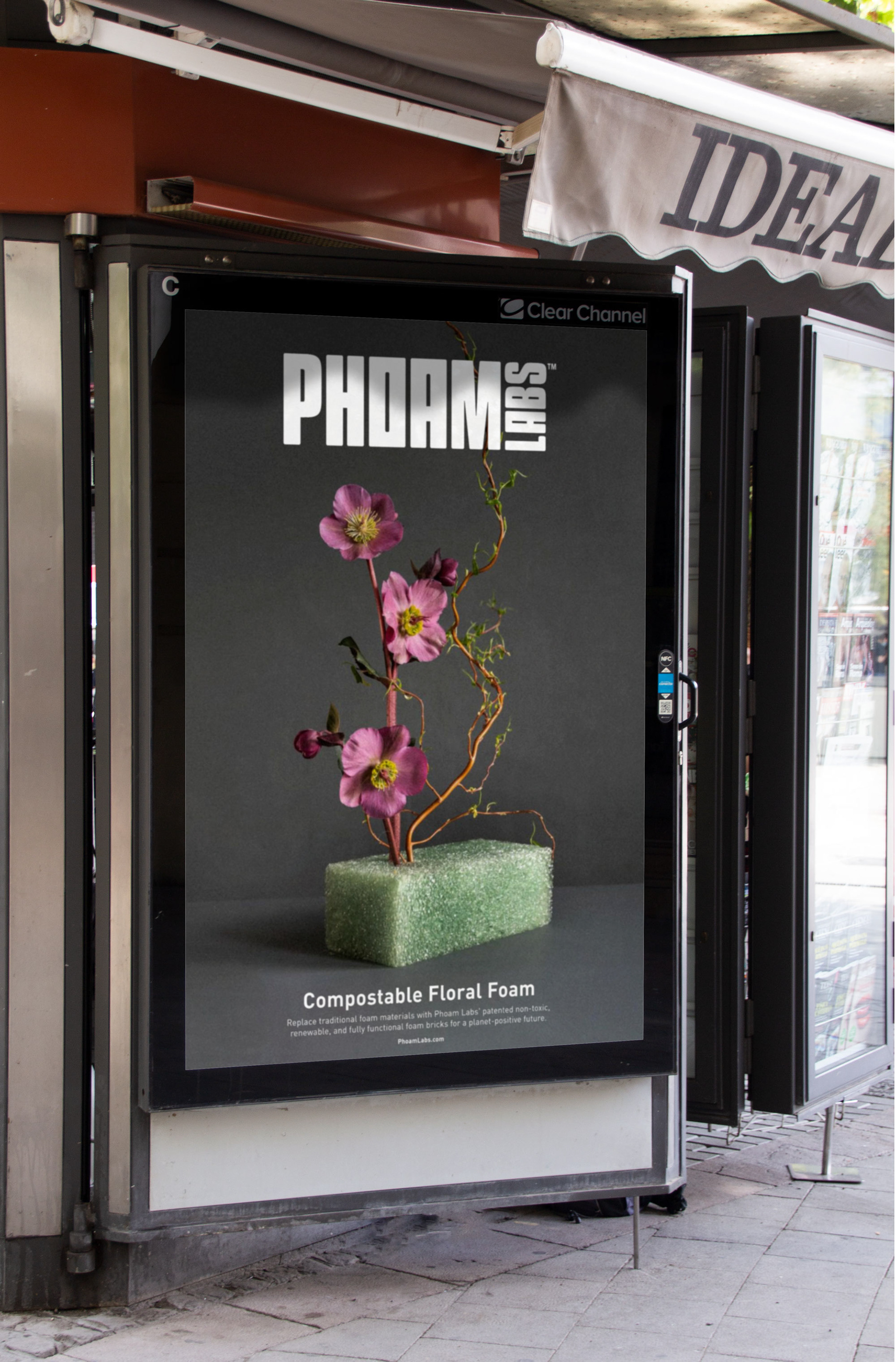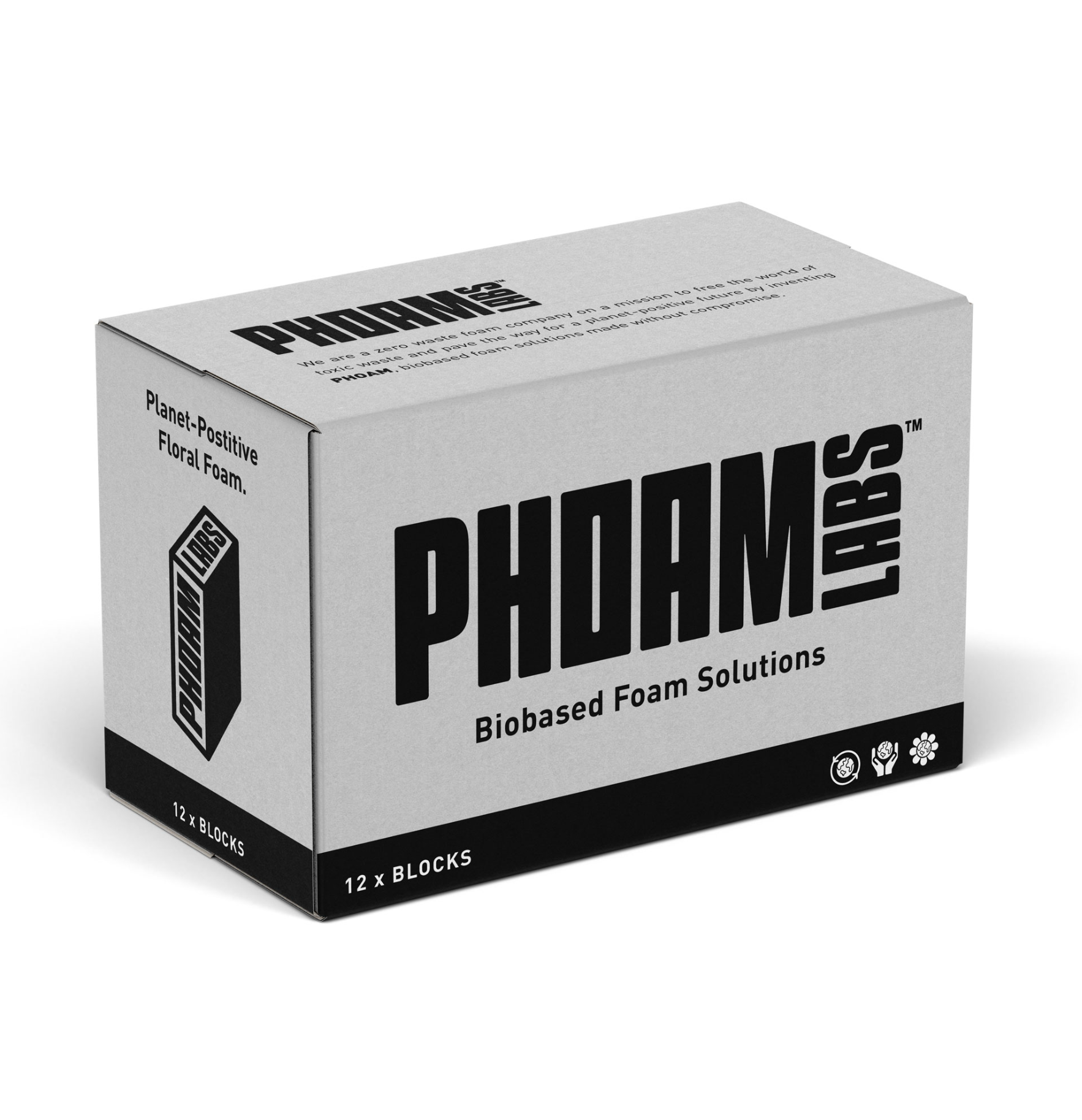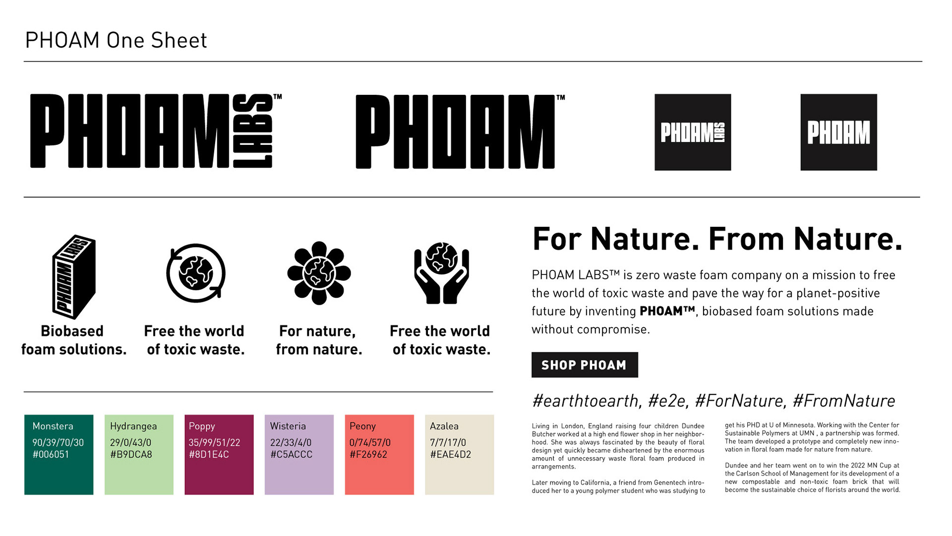 PHOAM LABS™ is a zero-waste foam company on a mission to build a sustainable future with PHOAM™, a biobased solution made without compromise. We collaborated with founder Dundee Butcher and her team to refresh the brand and develop an identity that embodies their commitment to sustainability. The wordmark draws inspiration from the block-shaped PHOAM products, with custom letterforms reflecting the foam’s pliability. Its minimalist, technical design stands out in the floral industry, emphasizing the company’s innovative approach to creating sustainable products.